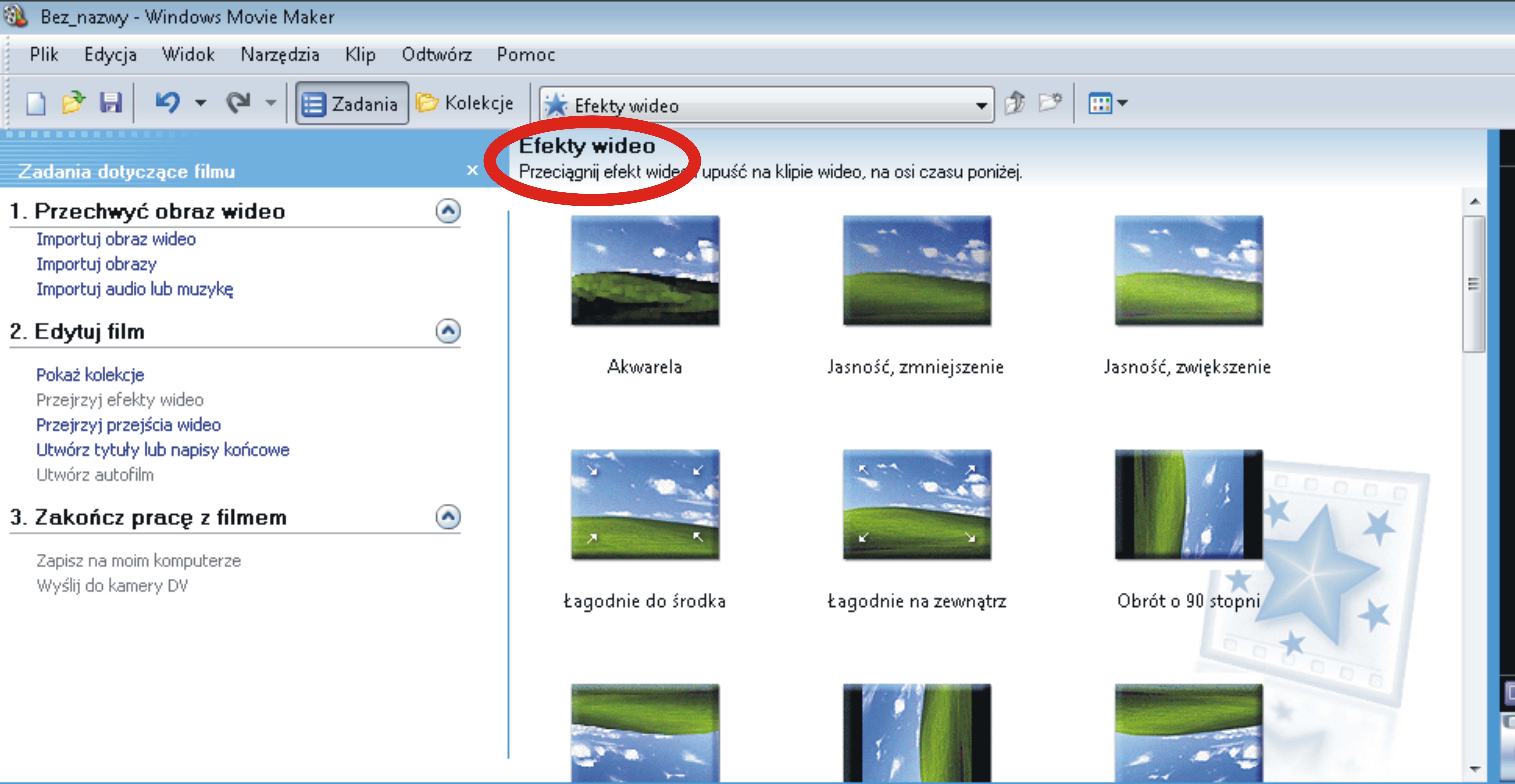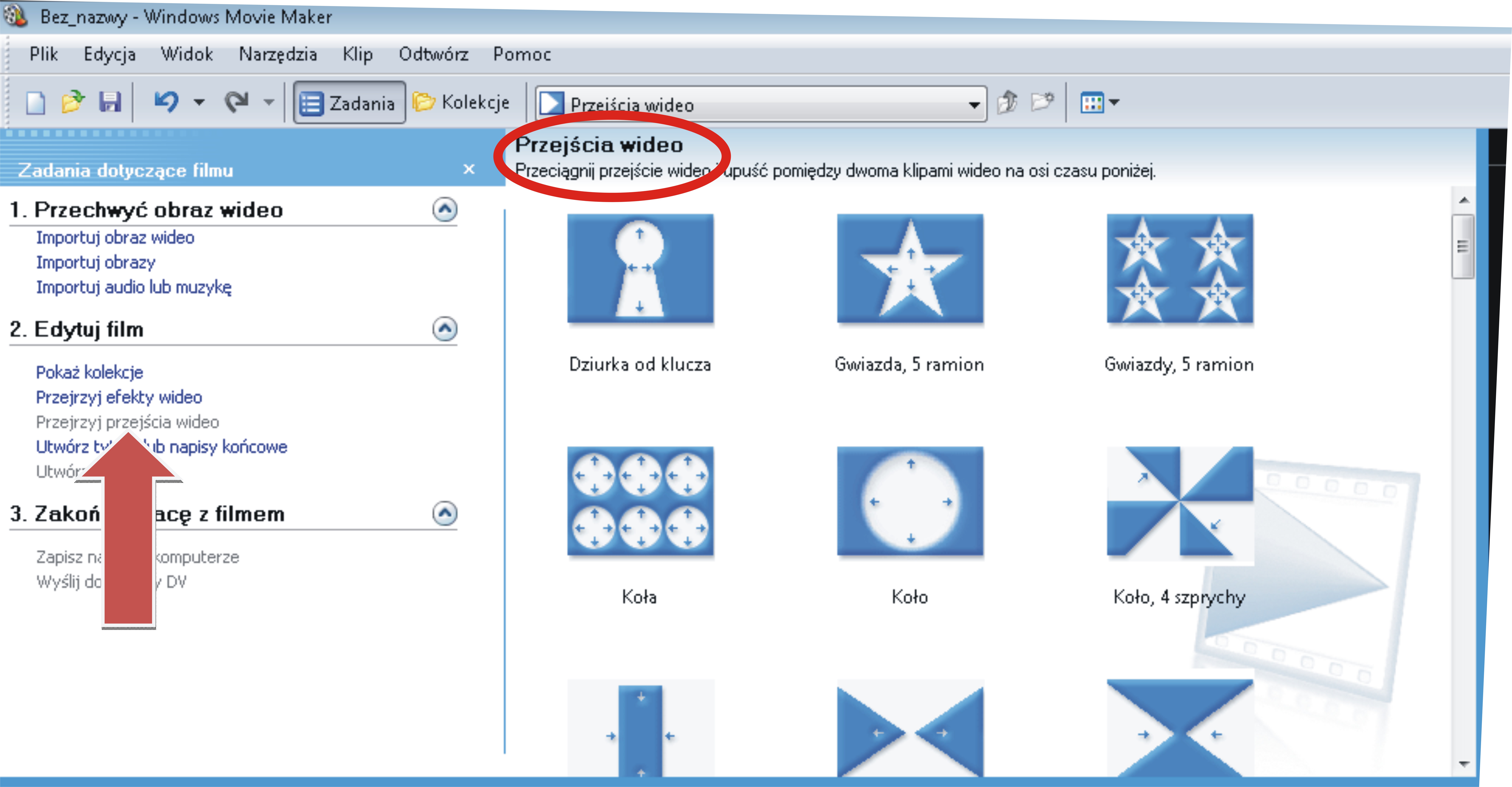Program Windows Movie Maker oferuje nam bardzo dużą ilość przejść wideo. Służą one do łączenia filmów lub zdjęć. Wybrany efekt zaznaczamy myszą oraz przeciągamy na oś czasu pomiędzy wybrane fragmenty filmu lub pomiędzy zdjęcia. Możliwe jest także wstawienie przejścia pomiędzy film a zdjęcie.