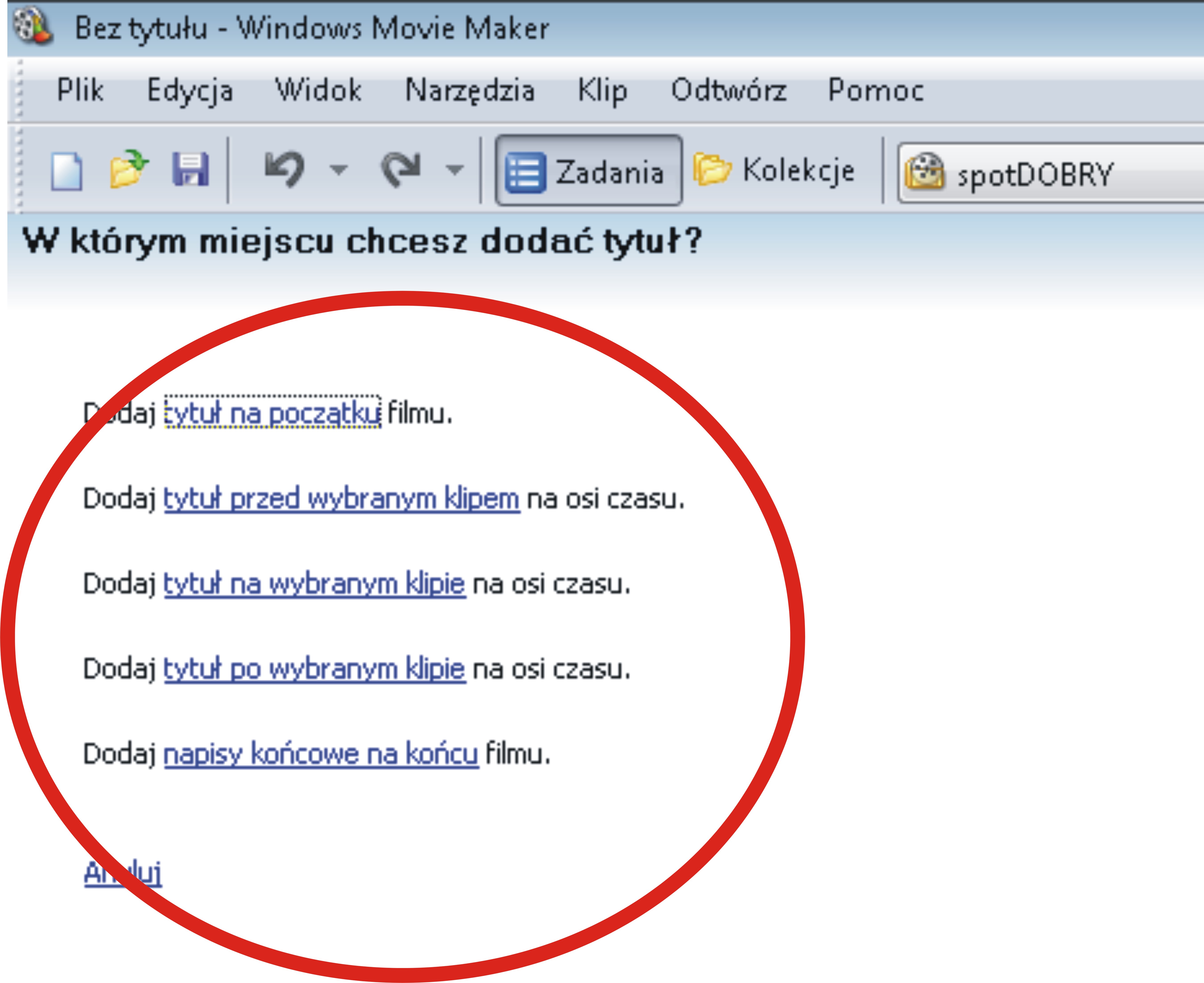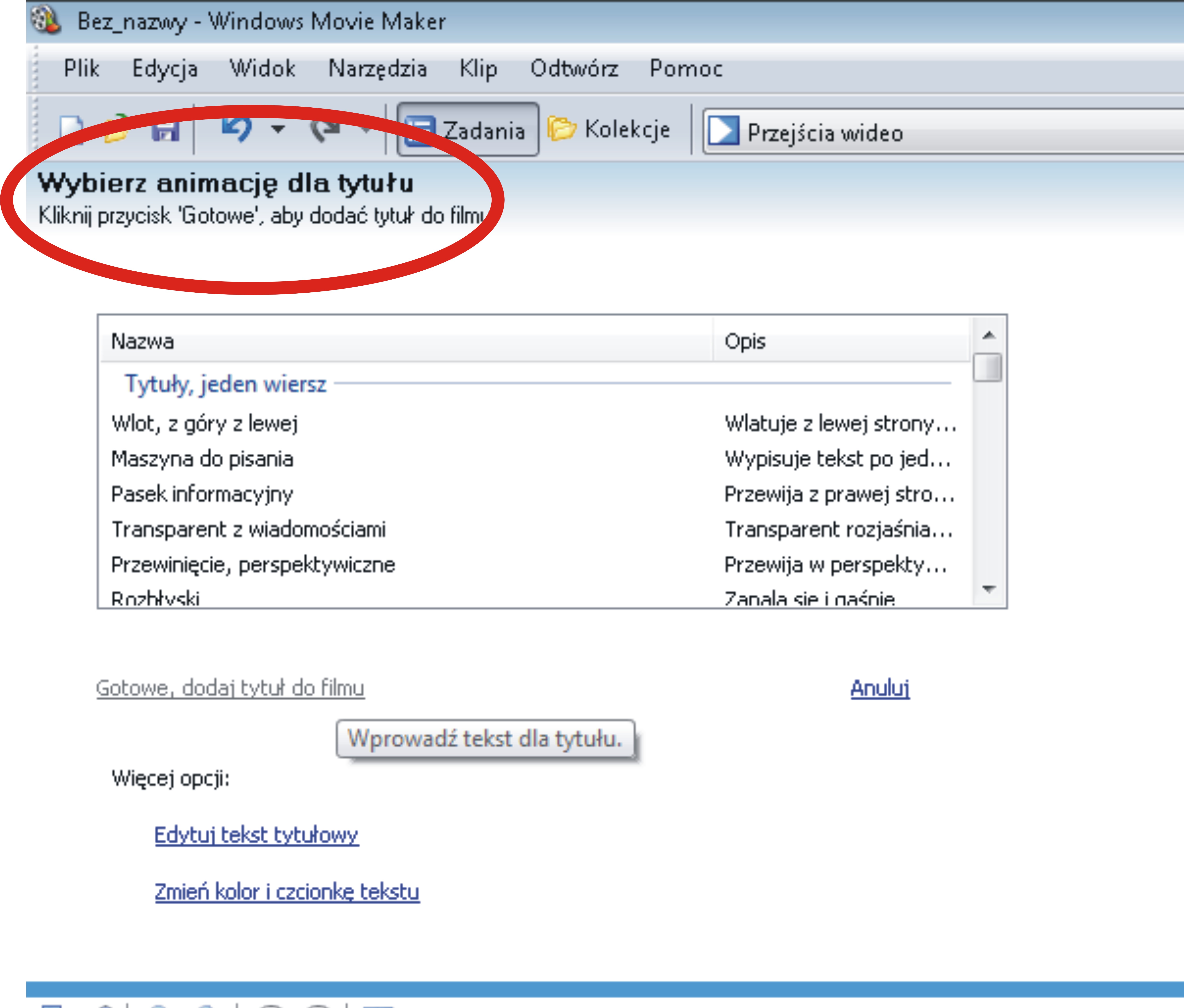 Przygotowana w programie opcja umożliwia nam wstawianie tytułów lub napisów na tworzonym przez nas filmie lub pokazie. Wprowadzając własną treść mamy możliwość wyboru czcionki, koloru i odpowiedniego efektu, który ukazuje się zawsze w okienku podglądu po prawej stronie. Możemy go zatwierdzić lub zmodyfikować.