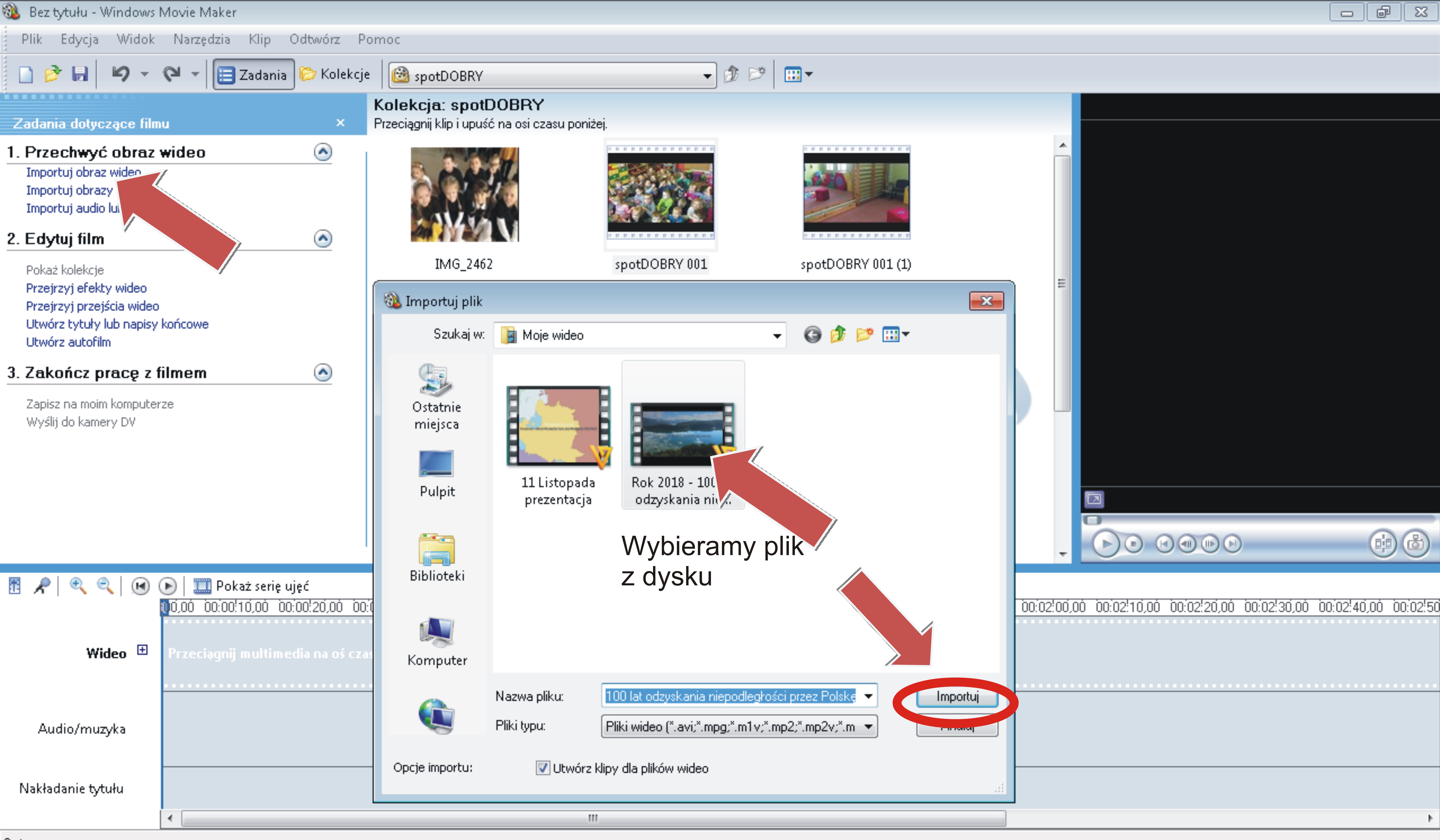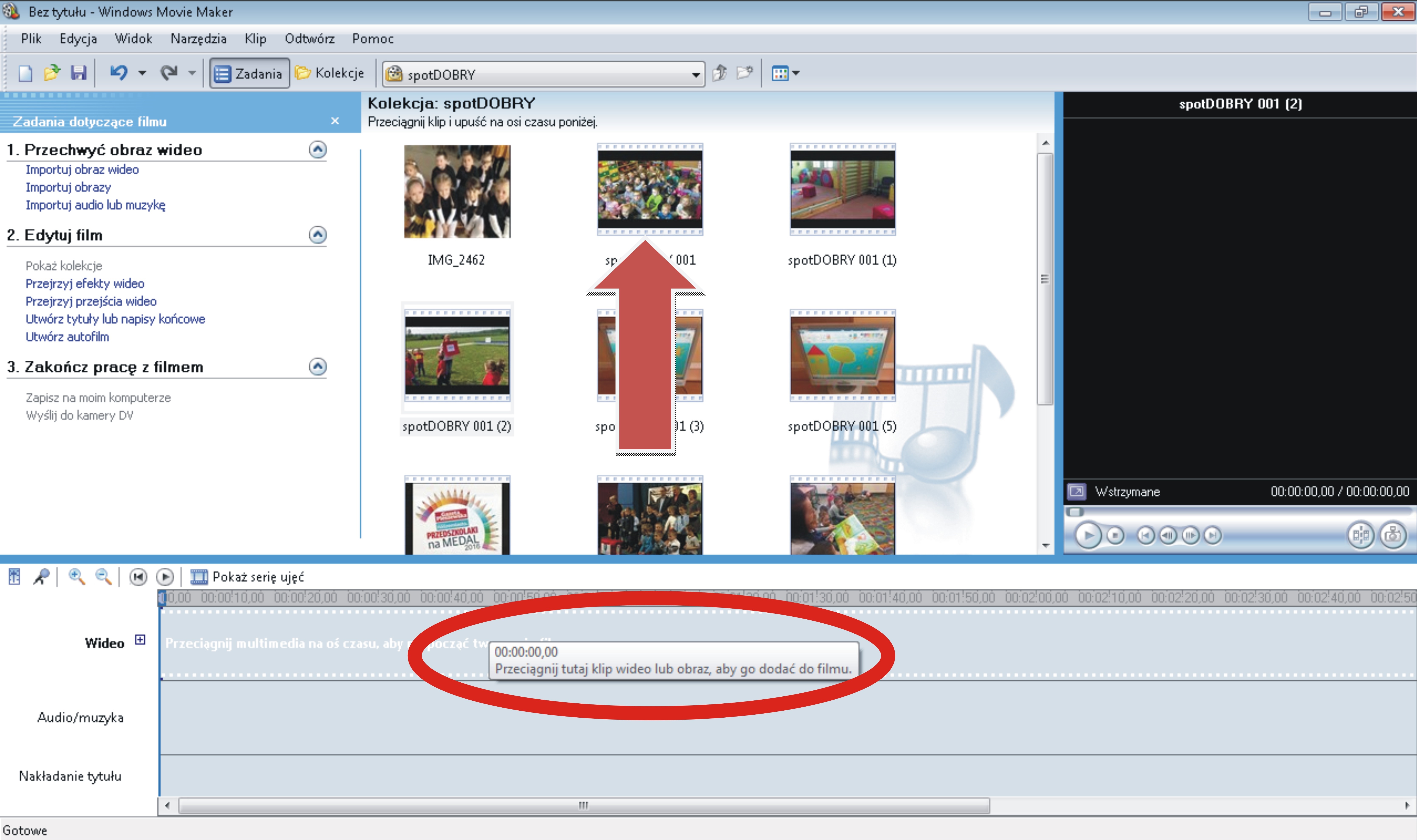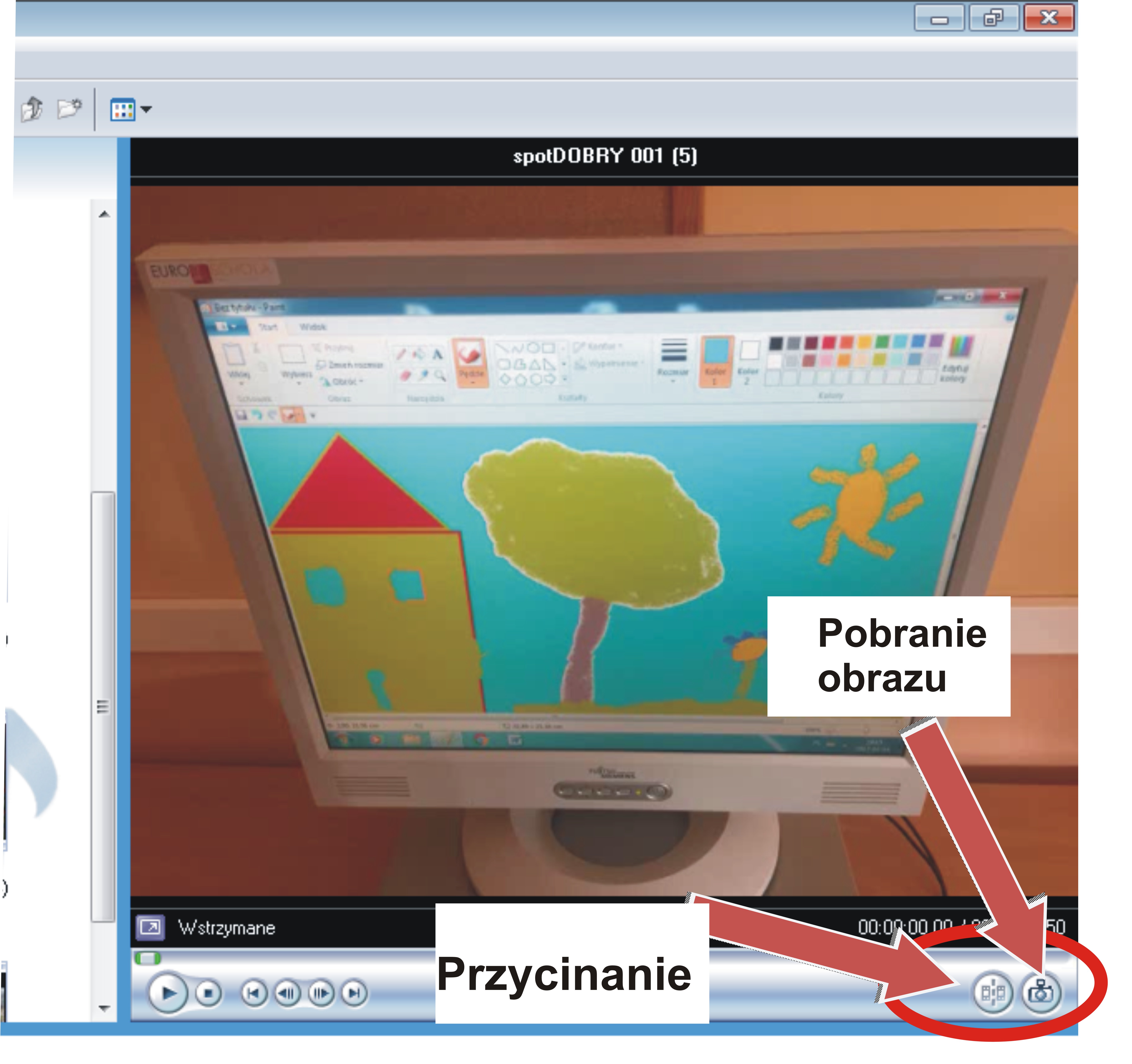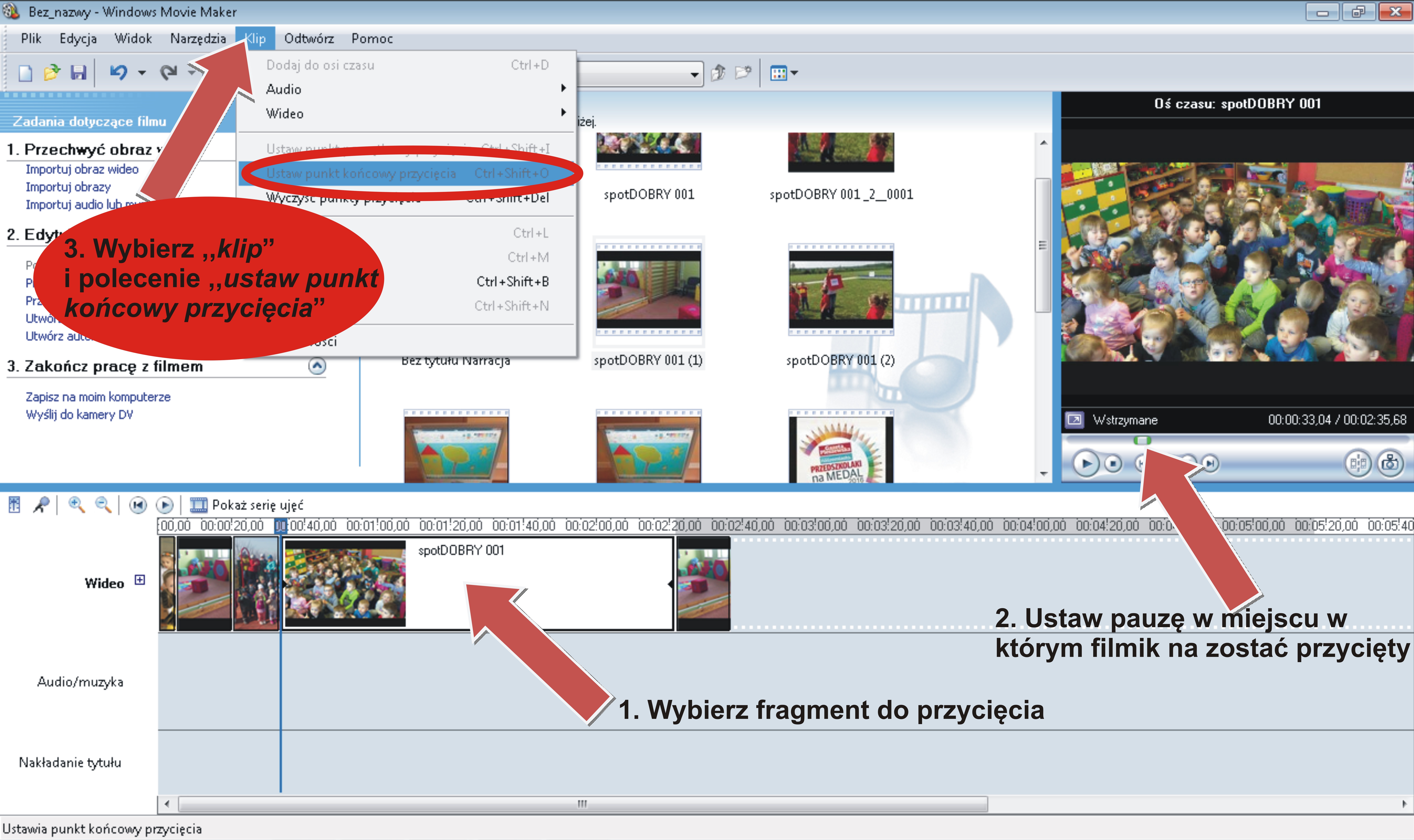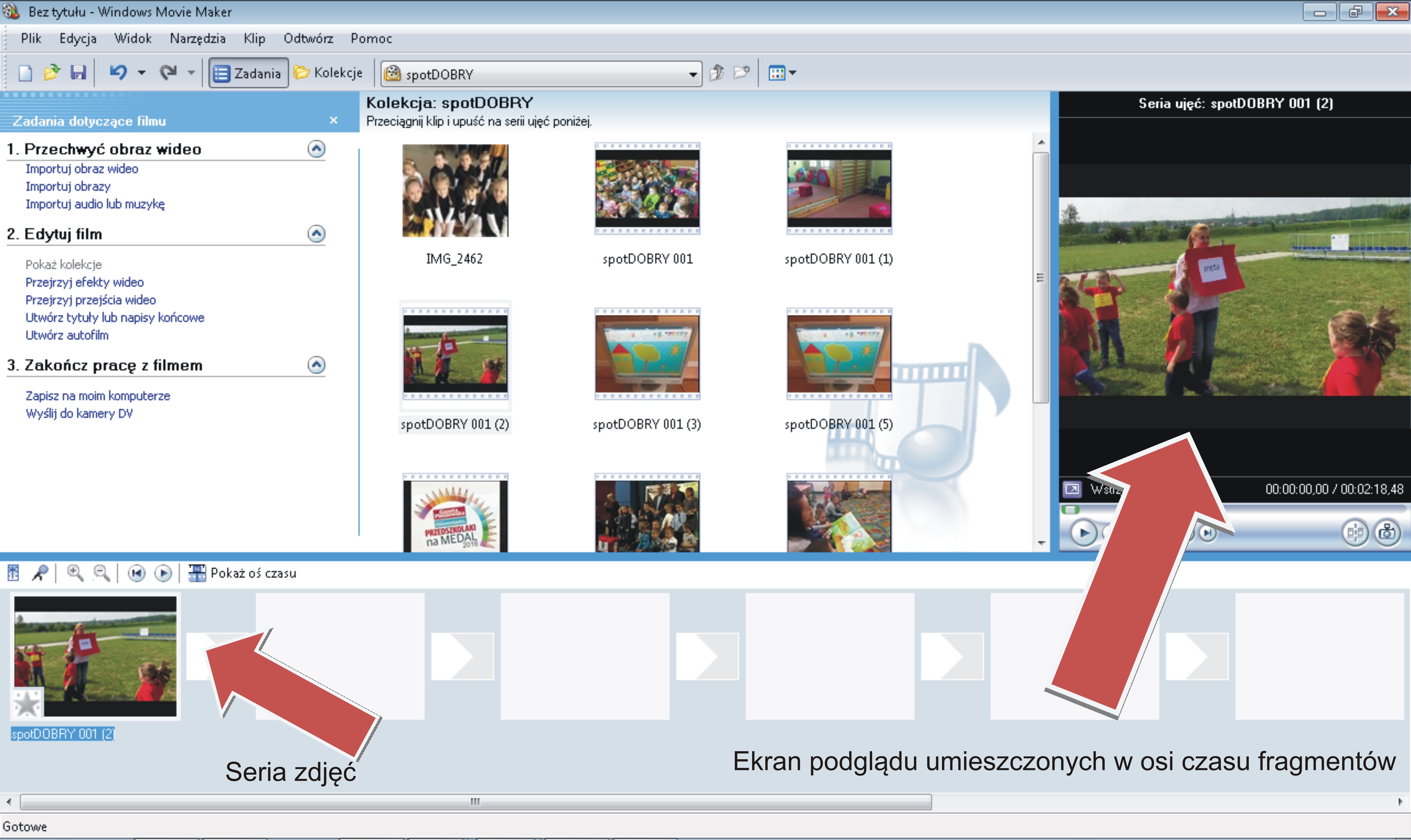 Program Windows Movie Maker daje nam także możność przycinania zaimportowanych filmików oraz wycinania niepotrzebnych fragmentów. Używamy do tego narzędzia znajdującego się przy okienku podglądu. Obok niego zauważyć można także ikonę aparatu, która pozwala nam pobrać i zapisać obraz podglądu.